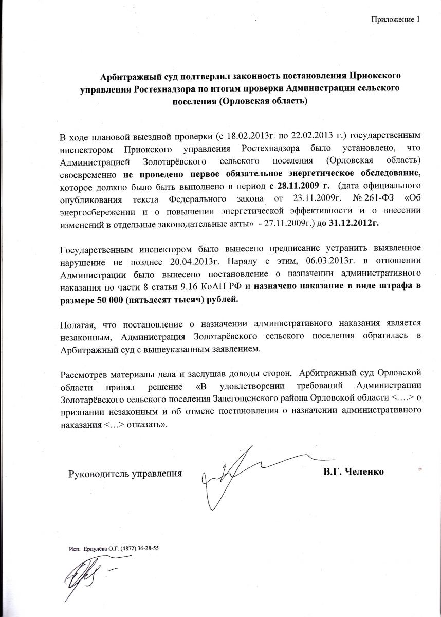 Арбитражный суд подтвердил законность постановления Приокского управления Ростехнадзора по итогам проверки Администрации сельского поселения (Орловская область)
